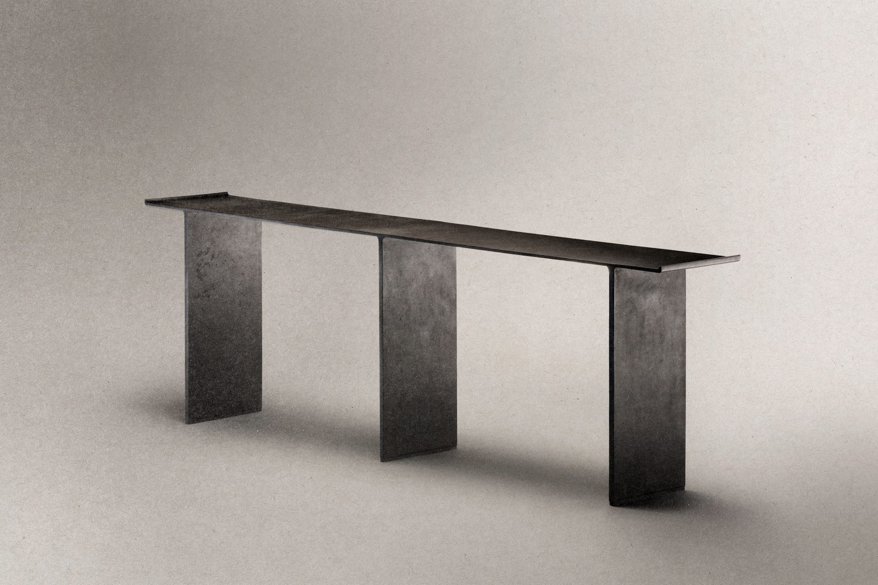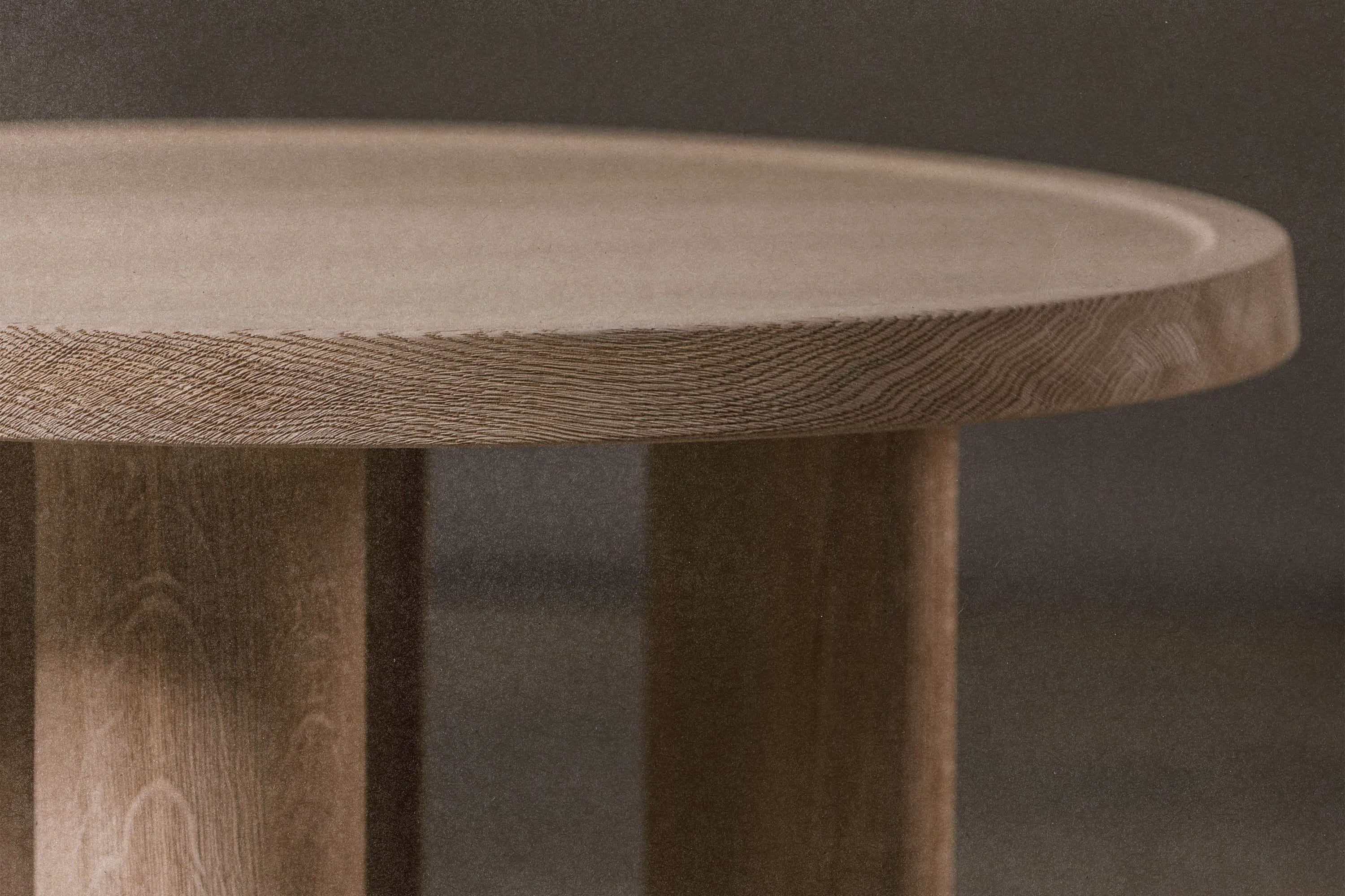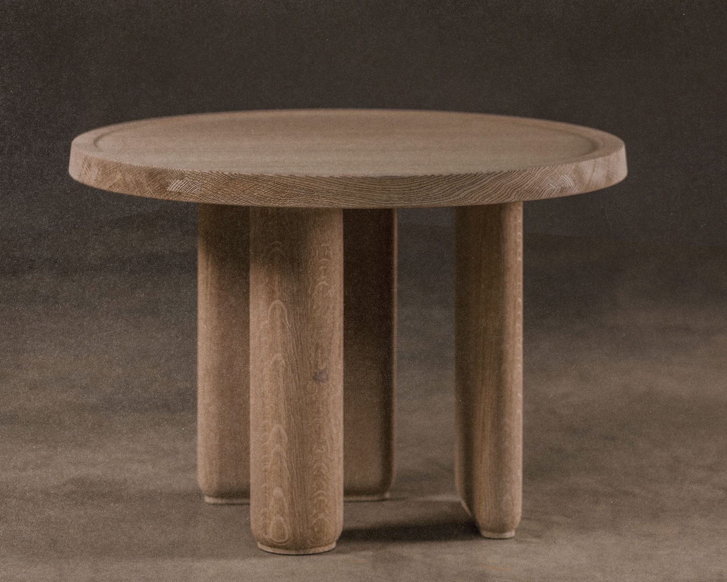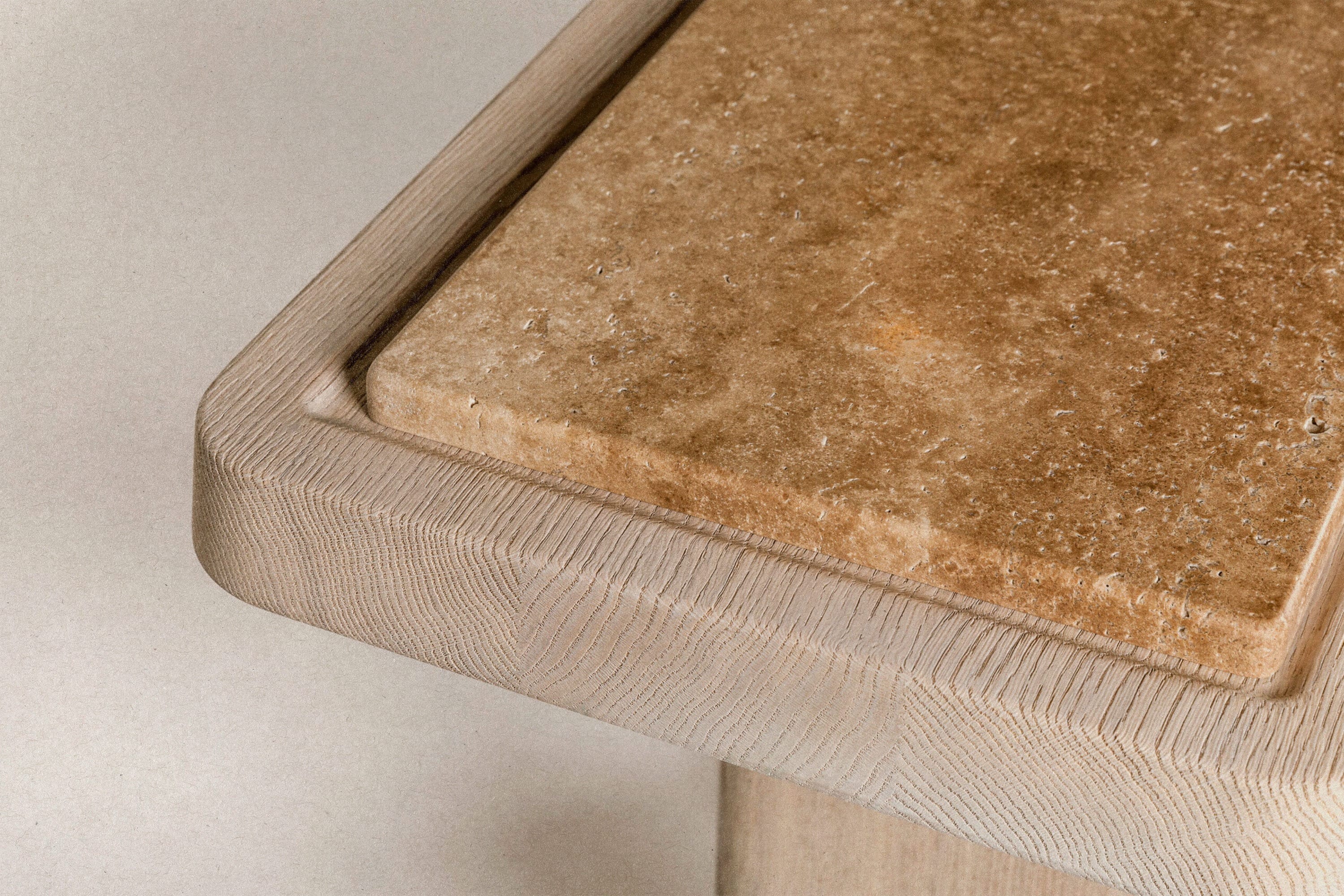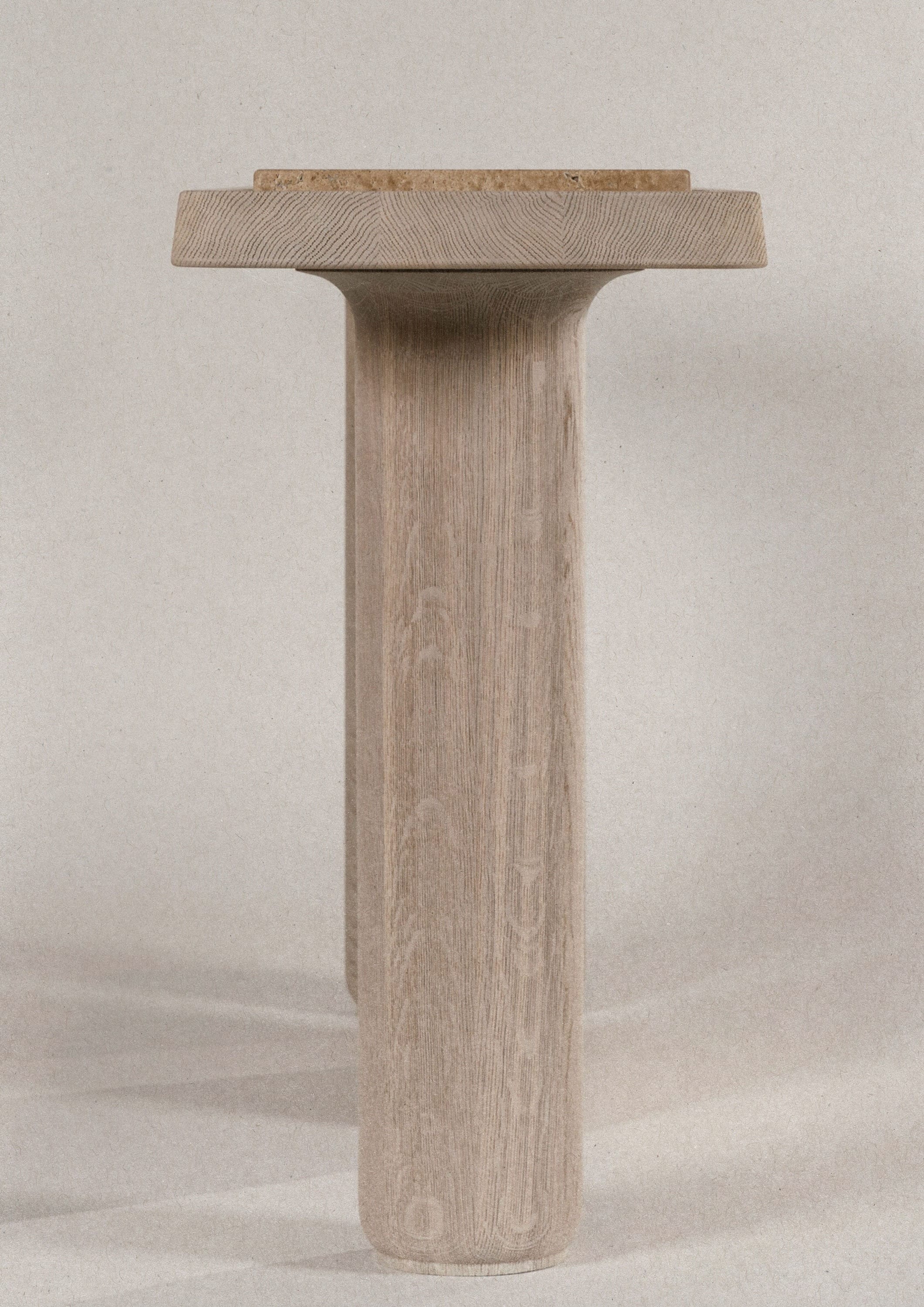 - Tondo Console, clear tinted brushed oak and classic travertine