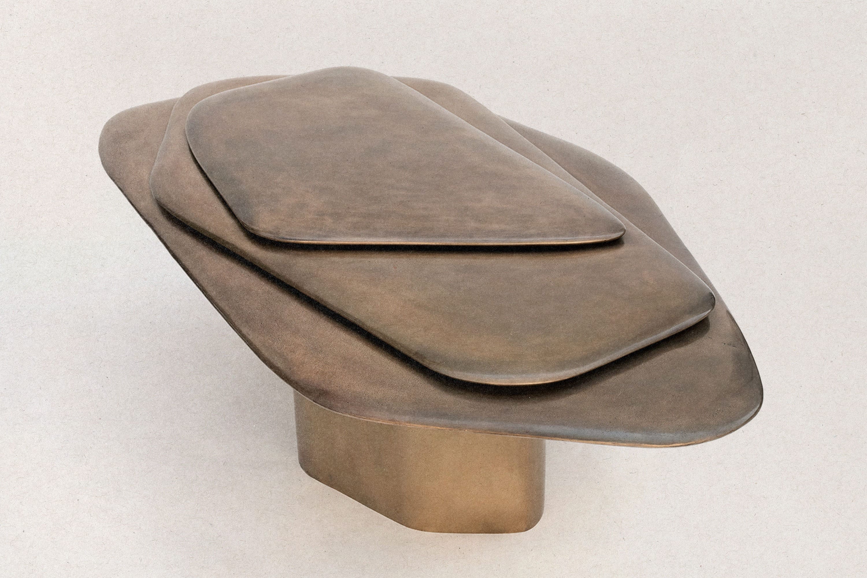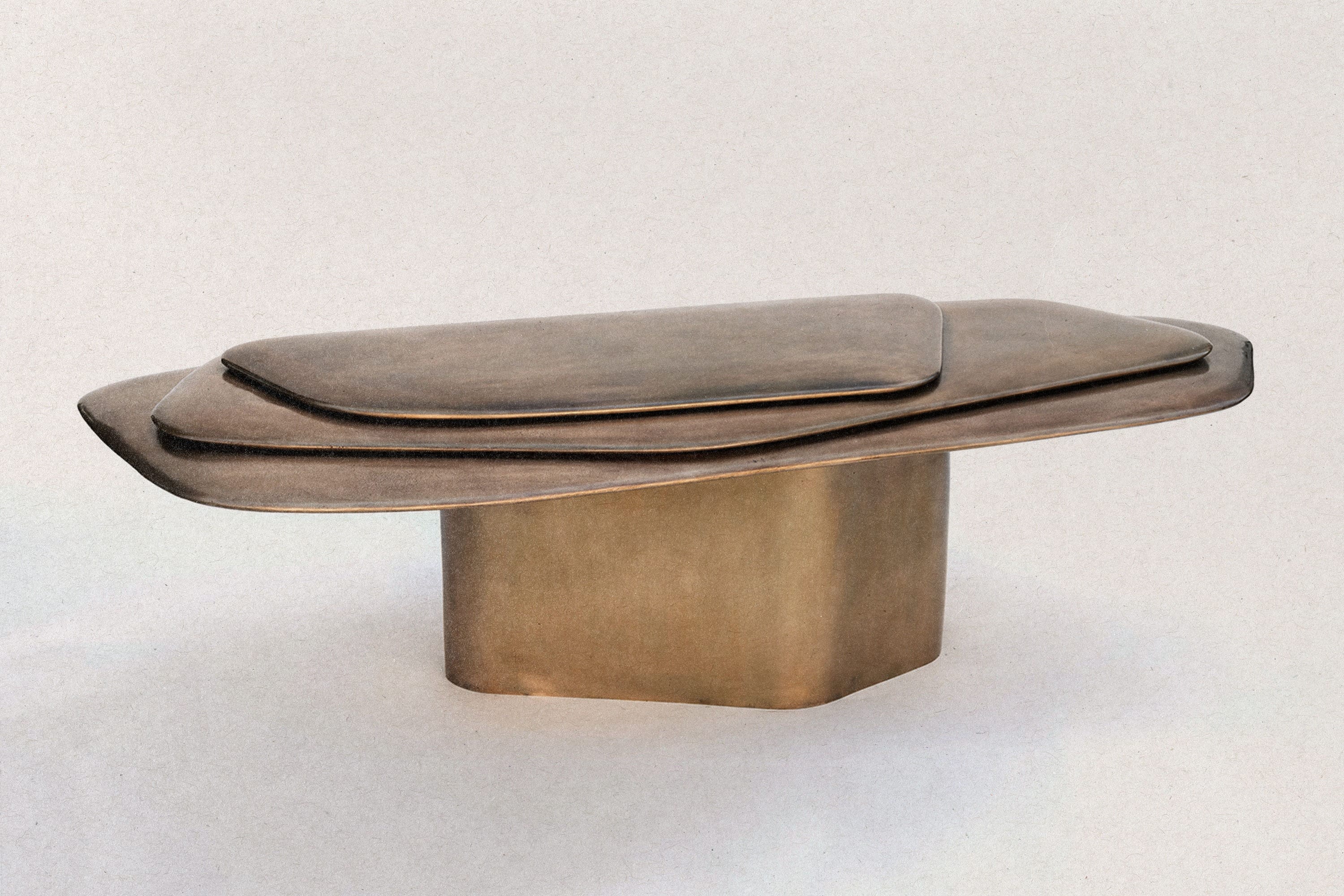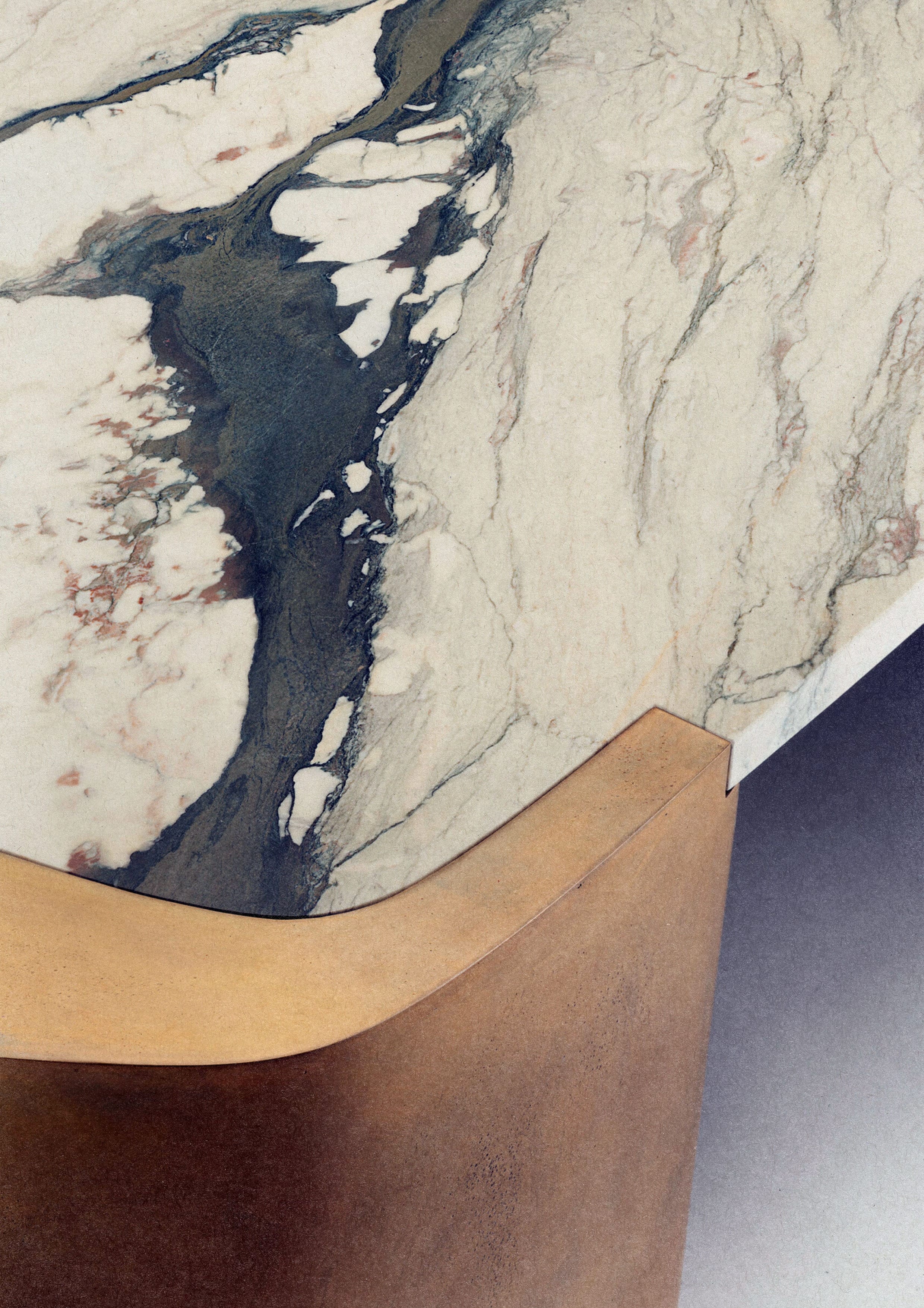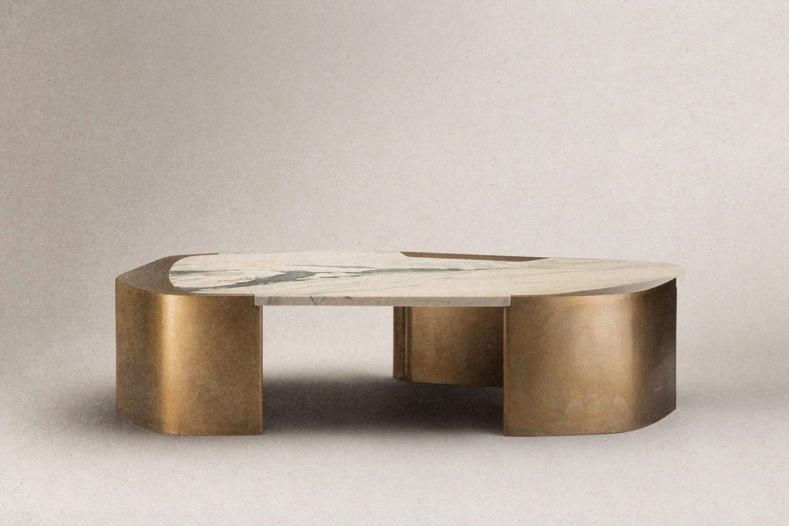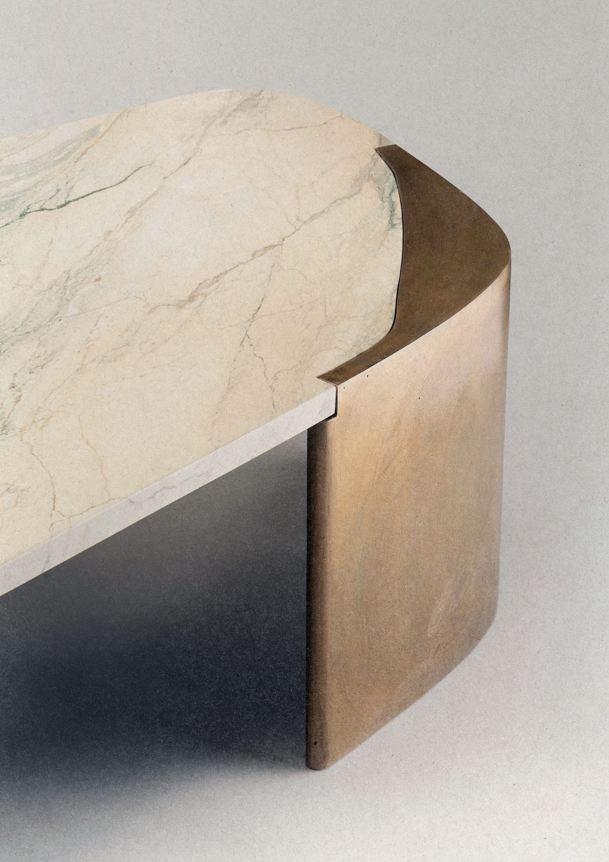 - Large Edge Three Coffee Table, Breccia Medicea marble and patinated bronze